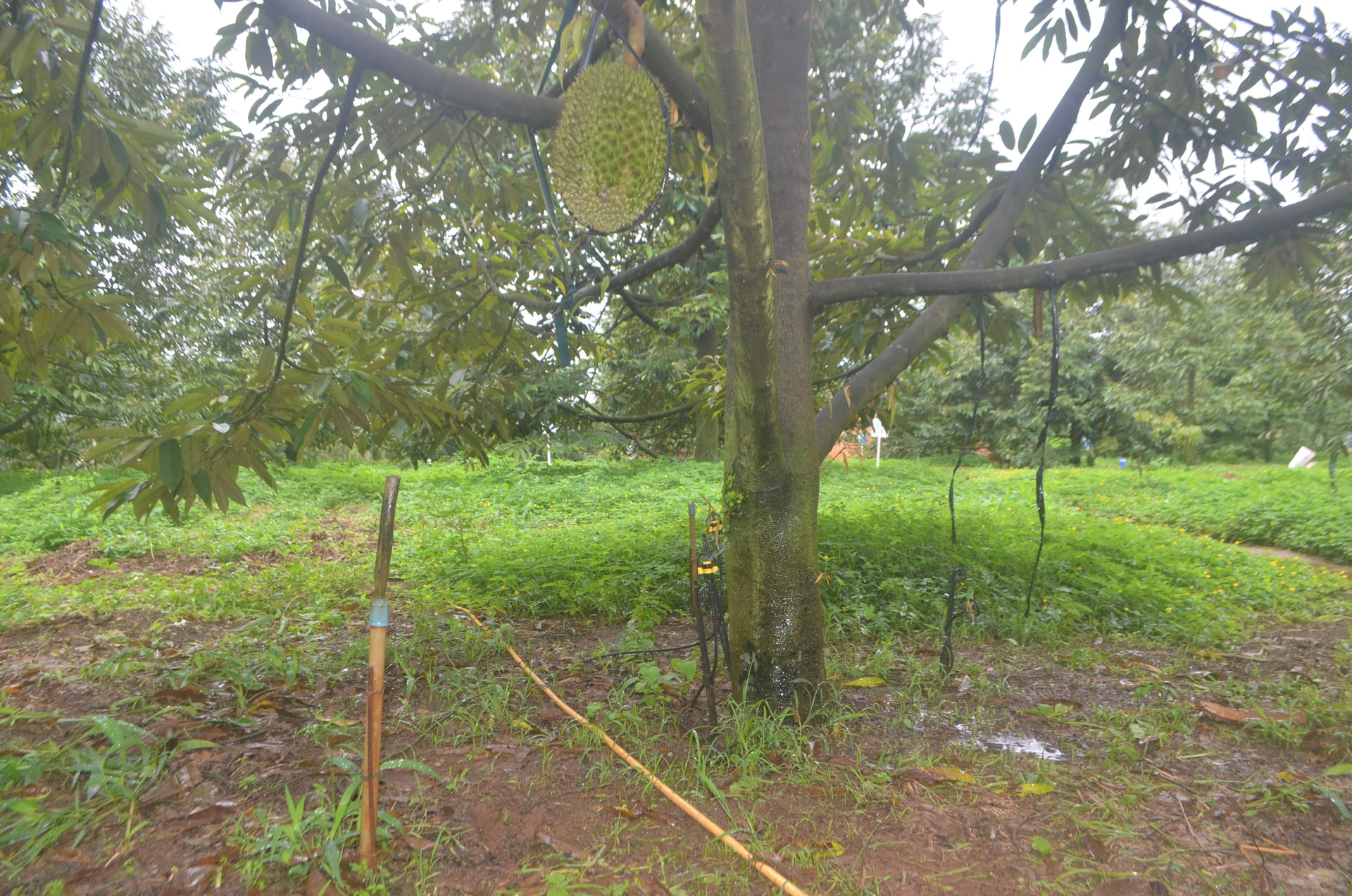 Vườn sầu riêng của gia đình ông Bùi Quốc Việt sử dụng hệ thống tưới nước, bón phân tiên tiến giúp cây trồng phát triển ổn định hơn.
