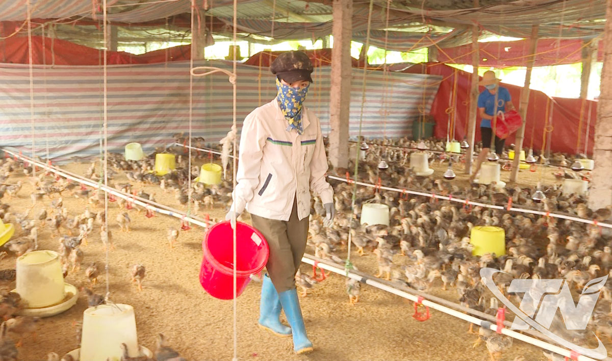 | Chị Thiều Thị Thanh Tâm, ở xóm Việt Ninh, xã Kha Sơn, chăm sóc đàn gà giống được phục hồi sau lũ. |