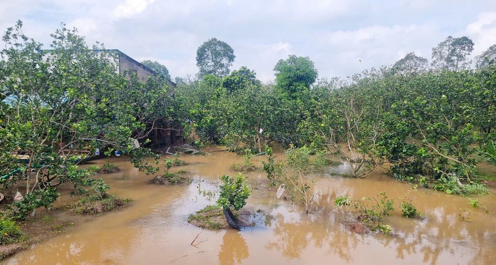 | Triều cường dâng cao gây sạt lở, làm ngập nhiều vườn cây ăn trái. |