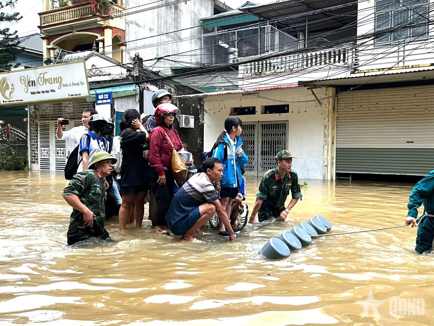 Bộ đội đưa người dân ra khỏi vùng ngập lụt do ảnh hưởng của bão số 10. |