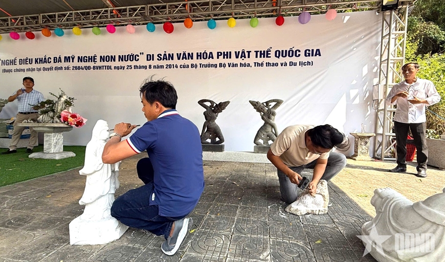 Các nghệ nhân chế tác nghệ thuật đá mỹ nghệ Non Nước tại cuộc thi điêu khắc đá Non Nước 2026. |