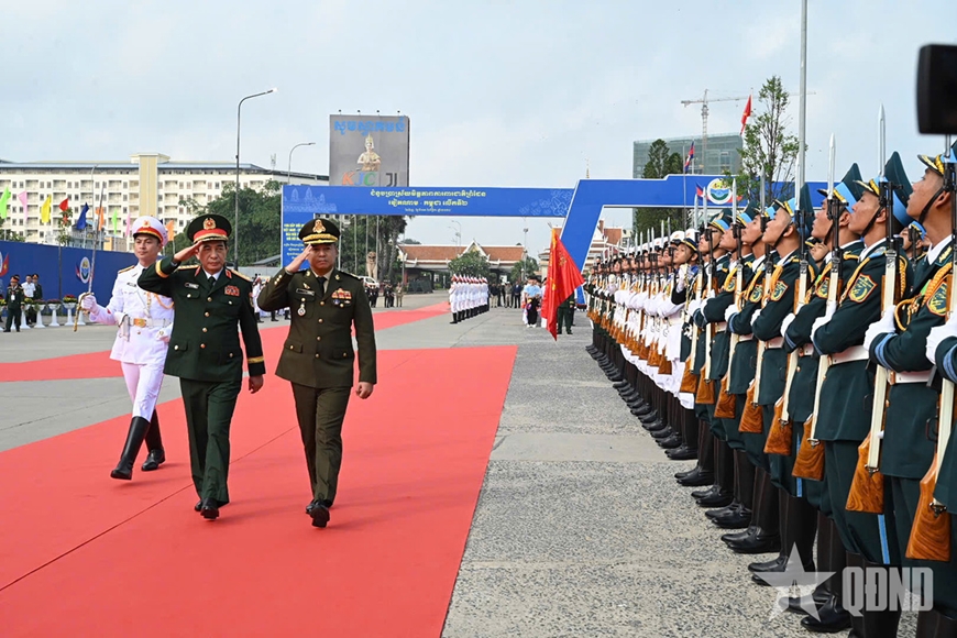 | Đại tướng Phan Văn Giang và Đại tướng Tea Seiha duyệt Đội danh dự Quân đội nhân dân Việt Nam. |