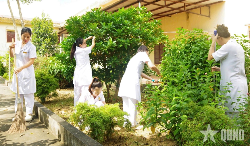 Y, bác sĩ Khoa Dược, Bệnh viện Quân y 109, Cục Hậu cần - Kỹ thuật Quân khu 2 chăm sóc vườn thuốc Nam của đơn vị. Ảnh: TRẦN HÀO