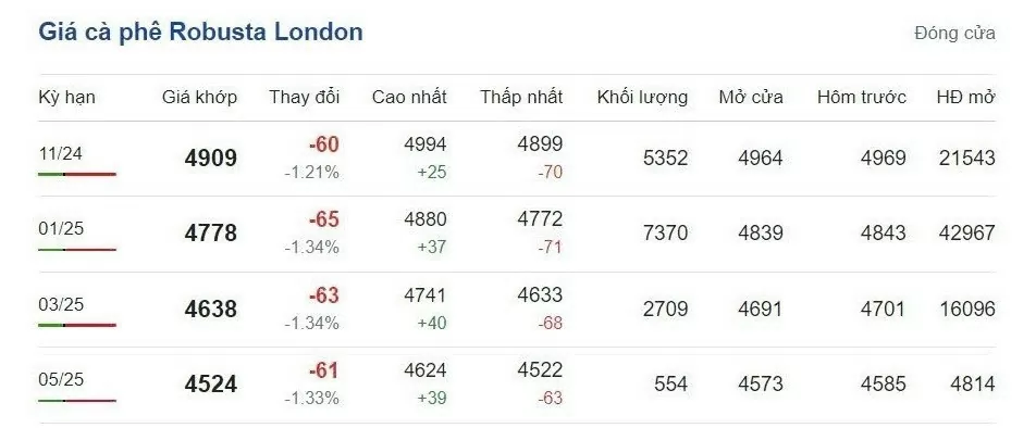 Kết thúc phiên giao dịch, giá cà phê Robusta trên sàn London ngày 16/10/2024 lúc 5h30 giao dịch ở mức 4.524 - 4.909 tấn. Cụ thể, kỳ hạn giao hàng tháng 11/2024 là 4.909 USD/tấn, giảm 60 USD/tấn; kỳ hạn giao hàng tháng 1/2025 là 4.778 USD/tấn, giảm 65 USD/tấn; kỳ hạn giao hàng tháng 3/2025 là 4.638 USD/tấn, giảm 63 USD/tấn và kỳ hạn giao hàng tháng 5/2025 là 4.524 USD/tấn, giảm 61 USD/tấn.