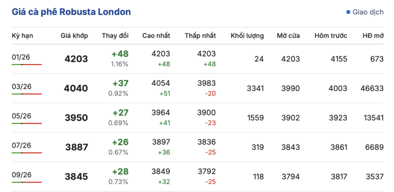 Kết thúc phiên giao dịch gần nhất, giá cà phê Robusta tại London tăng nhẹ liên tục trong các kỳ giao hàng. Cụ thể, kỳ giao tháng 1/2026 tiếp tục tăng nhẹ 48 USD/tấn, lên mức 4203 USD/tấn. Trong khi đó, hợp đồng giao kỳ hạn tháng 9/2026 cũng đảo chiều tăng thêm 28 USD/tấn, đạt mức 3845 USD/tấn.