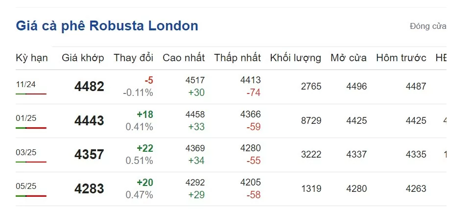 Kết thúc phiên giao dịch, giá cà phê Robusta trên sàn London ngày 24/10/2024 lúc 4h30 tăng, giảm trái chiều ở mức 4.283 - 4.482 USD/tấn. Cụ thể, kỳ hạn giao hàng tháng 11/2024 là 4.482 USD/tấn (giảm 5 USD/tấn); kỳ hạn giao hàng tháng 1/2025 là 4.443 USD/tấn (tăng 18 USD/tấn); kỳ hạn giao hàng tháng 3/2025 là 4.357 USD/tấn (tăng 22 USD/tấn) và kỳ hạn giao hàng tháng 5/2025 là 4.283 USD/tấn (tăng 20 USD/tấn).