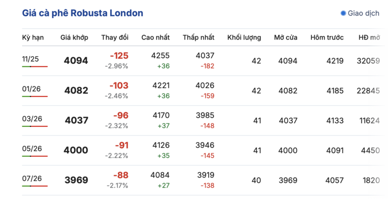 Cụ thể, kết thúc phiên giao dịch sáng ngày 26/9, trên sàn giao dịch London, giá cà phê trực tuyến Robusta chứng kiến thị trường rớt giá nhẹ. Theo đó hợp đồng giao kỳ hạn tháng 11/2025 đạt 4.094 USD/tấn. Hợp đồng giao kỳ hạn tháng 1/2026 đạt 4.082 USD/tấn.