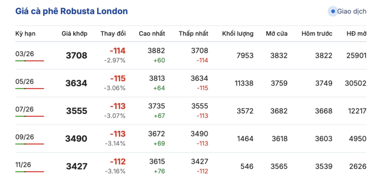Kết thúc phiên giao dịch gần nhất, giá cà phê Robusta tại London đảo chiều sụt giảm sâu đồng loạt trong các kỳ giao hàng. Cụ thể, kỳ giao tháng 1/2026 lao dốc, giảm 114 USD/tấn, xuống mức 3708 USD/tấn. Trong khi đó, hợp đồng giao kỳ hạn tháng 9/2026 cũng giảm sâu 112 USD/tấn, đạt mức 3427 USD/tấn.