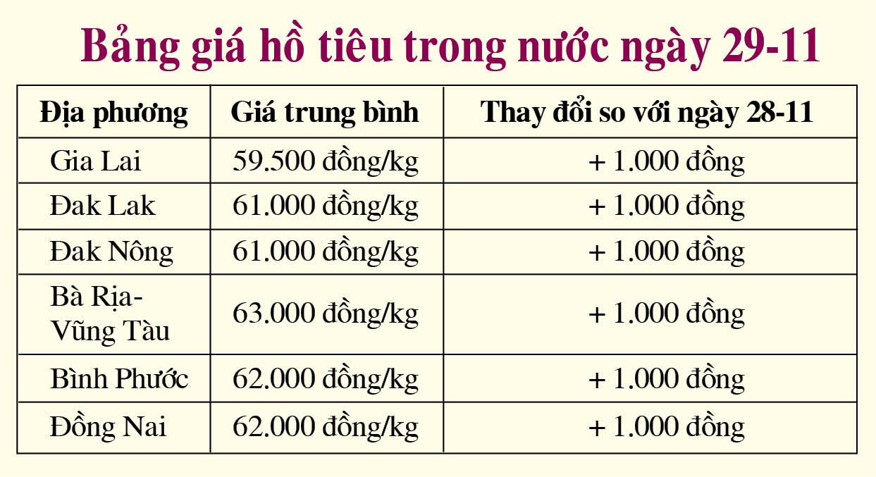Theo thông tin từ Báo Công thương, website giatieu.com, giá hồ tiêu trong nước ngày 29-11 tăng 1.000 đồng/kg tại các vùng trồng trọng điểm trên cả nước.