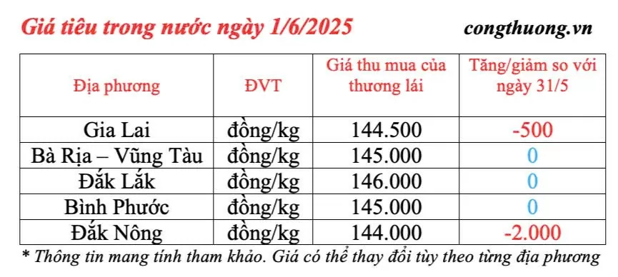 | Giá tiêu trong nước cập nhật sáng ngày 1/6/2025 |