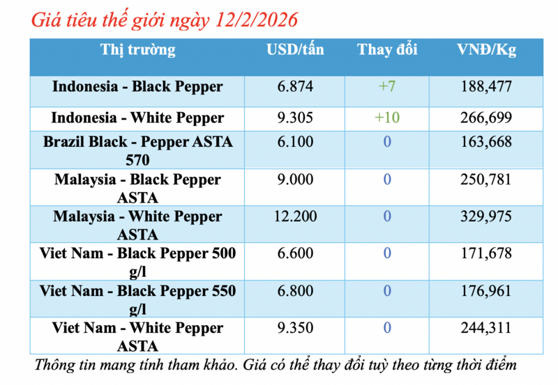 Cập nhật giá tiêu thế giới từ Hiệp hội Hồ tiêu Quốc tế (IPC) sáng 12/2/2026, hồ tiêu xuất khẩu hôm nay tiếp tục ghi nhận biến động từ thị trường Indonesia. Các thị trường đều duy trì mức giá ổn định so với phiên giao dịch hôm qua.