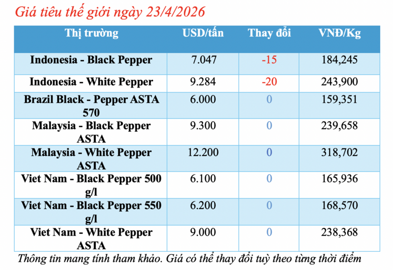 Cập nhật dữ liệu từ Hiệp hội Hồ tiêu Quốc tế (IPC) sáng 23/4/2026, hồ tiêu xuất khẩu hôm nay ghi nhận phiên đảo chiều giảm nhẹ từ thị trường Indonesia. Các thị trường xuất khẩu hồ tiêu lớn khác đều duy trì mức giá ổn định.