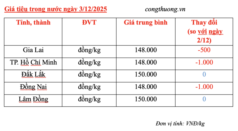 Trong khi đó, giá tiêu thị trường trong nước hôm nay (3/12) cũng giảm cục bộ một vài nơi từ 500 - 1.000 đồng/kg so với ngày hôm qua. Hiện giá tiêu trong nước giao dịch trong khoảng 148.000 - 150.000 đồng/kg.