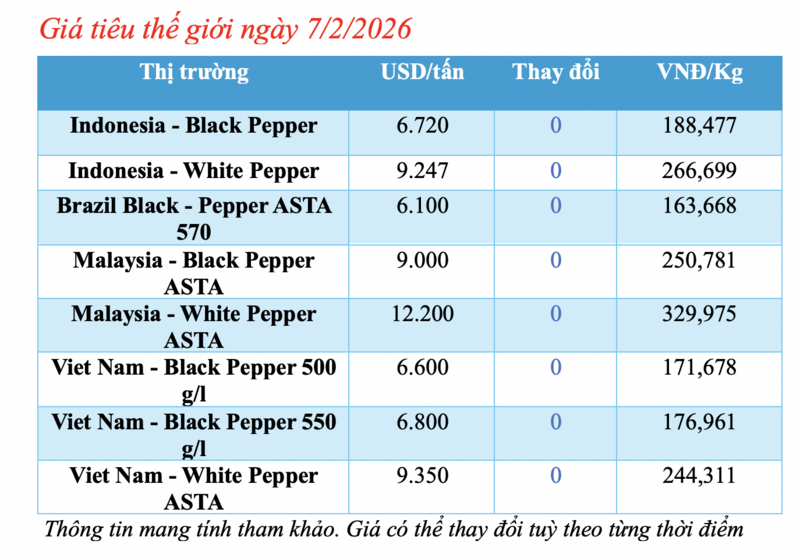Giá tiêu thế giới hôm nay 7/2/2026: Đi ngang