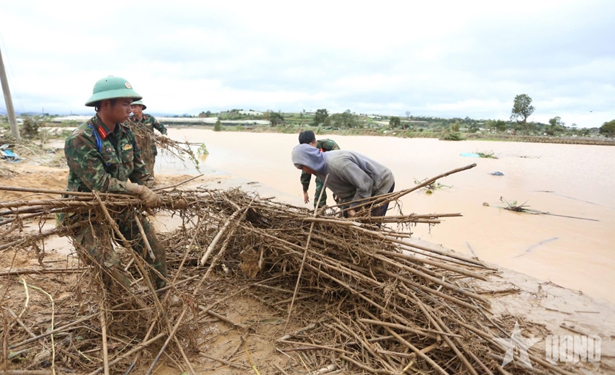 | Bộ đội hỗ trợ người dân D'ran dọn vệ sinh đồng ruộng sau lũ. |