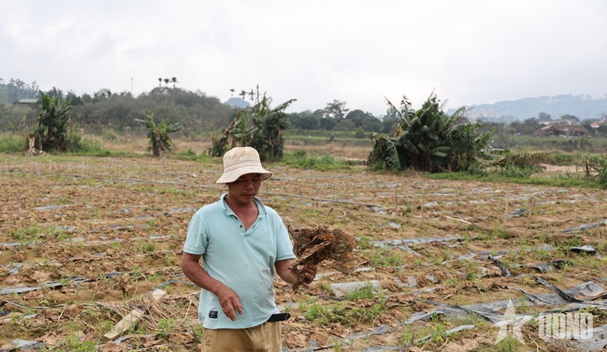 | Anh Phạm Tấn ở thôn Quảng Lạc, xã D'ran, tỉnh Lâm Đồng trên ruộng rau chỉ còn trơ lại gốc sau đợt lũ lịch sử. |