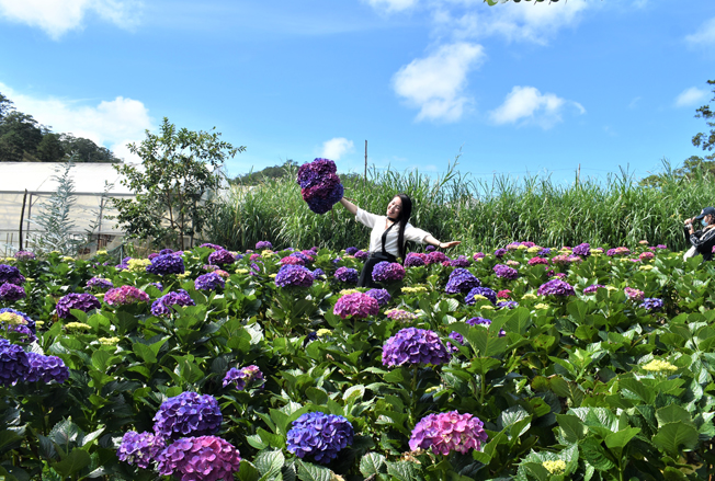 Khách check in từng góc ảnh hoa cẩm tú cầu tím ngoài trời |