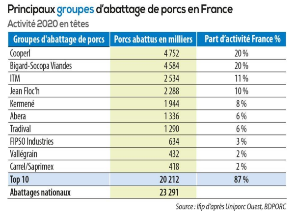 Việc giết mổ heo tại Pháp khá tập trung và chủ yếu là các công ty giết mổ. 10 doanh nghiệp giết mổ lớn nhất của Pháp chiếm 87% trong bản đồ giết mổ của quốc gia này. Các tập đoàn lớn như Cooperl, Bigard-Socopa Viandes chiếm 20% trong bản đồ giết mổ heo tại Pháp.