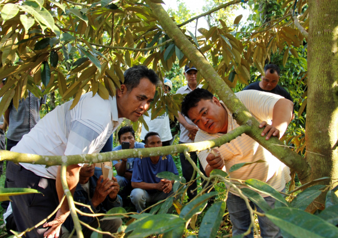 Các thành viên Chi hội nghề nghiệp trồng và chăm sóc cây sầu riêng buôn Ko Tam cùng tìm hiểu kỹ thuật xử lý phân hóa mầm hoa. |