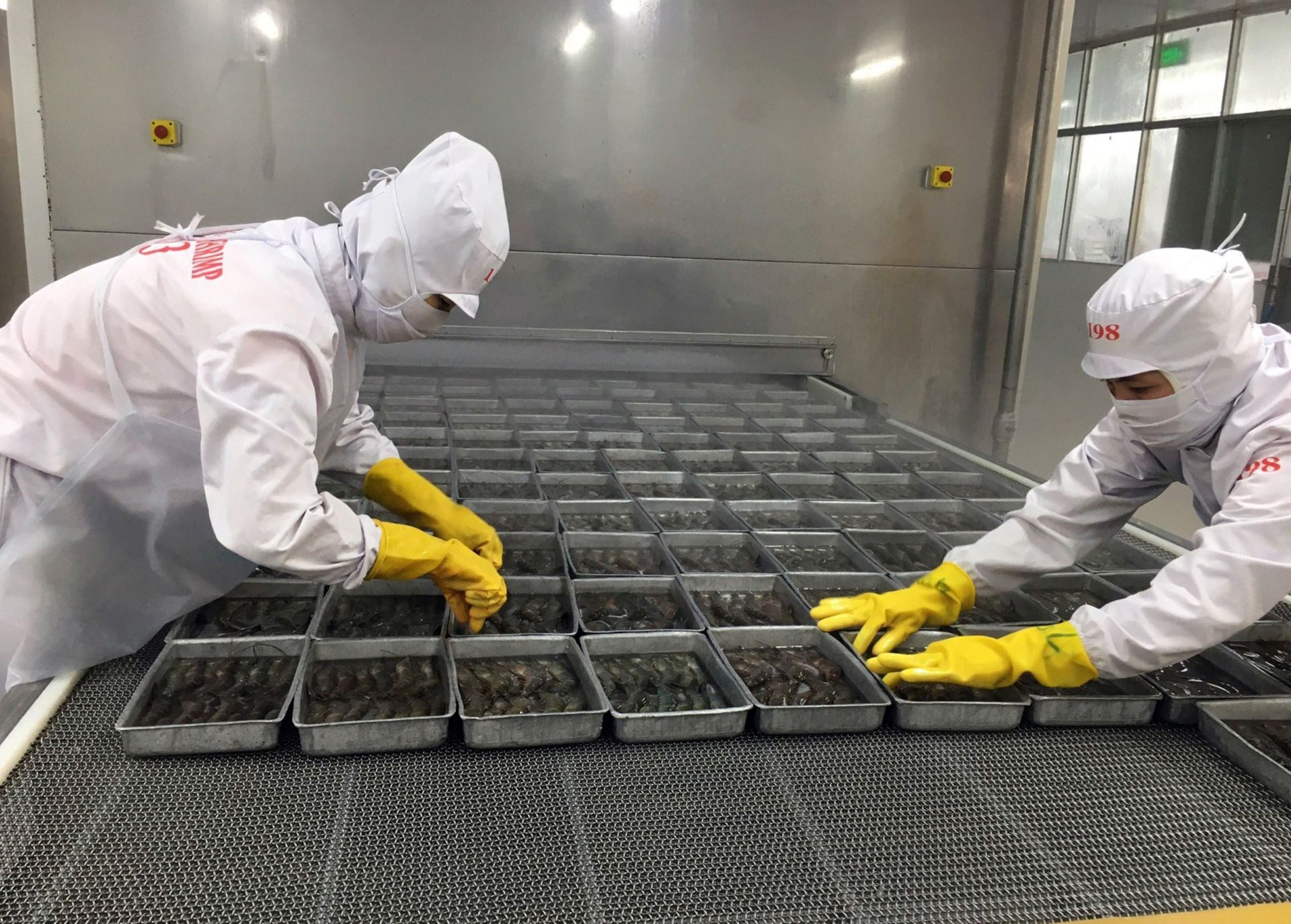 | Công nhân làm việc tại một nhà máy chế biến tôm tại tỉnh Cà Mau. Ảnh: ĐINH LẬP |