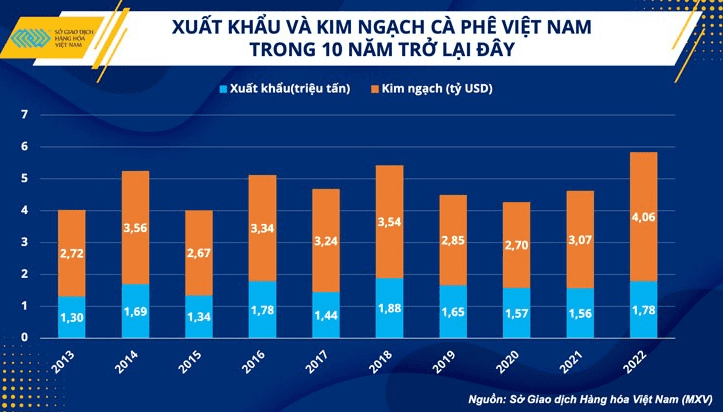 Năm 2022 là một rất thành công đối với hoạt động xuất khẩu cà phê của Việt Nam. Theo thống kê sơ bộ từ Tổng cục Hải quan, nước ta đã xuất khẩu được 1,78 triệu tấn cà phê trong năm vừa qua với tổng kim ngạch đạt trên 4,06 tỷ USD, là mức cao nhất trong hơn 1 thập kỷ trở lại đây. Thành công này đến từ việc đẩy mạnh xuất khẩu, khi giá cà phê trên thị trường đạt mức cao nhất kể từ năm 2011, kết hợp với việc Cục Dự trữ liên bang Mỹ (Fed) đã tăng lãi suất 7 lần liên tiếp khiến tỷ giá USD/VND tăng mạnh đột biến.