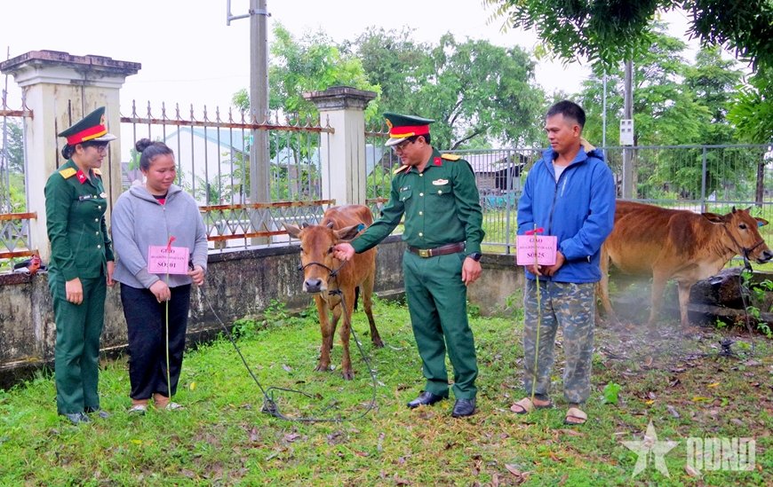| Trung tá Vũ Bá Thiết, Đoàn trưởng Đoàn Kinh tế - Quốc phòng 710 và đại diện cơ quan Binh đoàn 15 trao bò giống tặng người dân. |