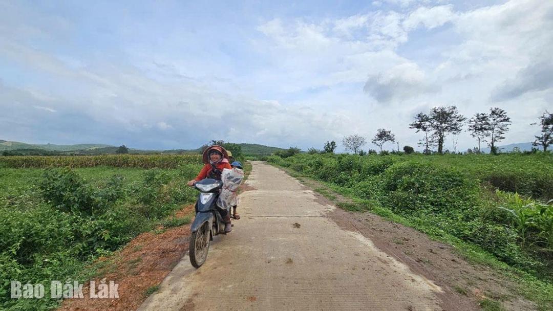 Người dân buôn Tliêr (xã Hòa Phong) lưu thông thuận lợi trên đoạn đường mới được thảm bê tông. |