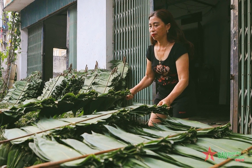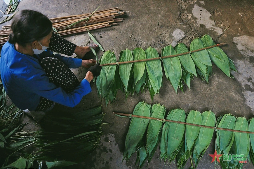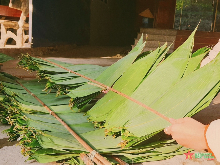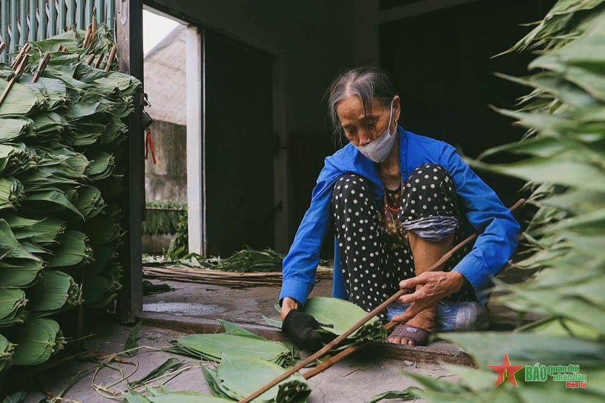 Lá tre sau khi được thu mua, phân loại sẽ được bà Đinh Thị Tịnh (76 tuổi) xếp lại và kẹp vào 2 thanh nứa, treo lên lò sấy khô. Việc sấy trên lò sẽ đảm bảo được hương vị thơm đặc trưng của lá tre Việt Nam.