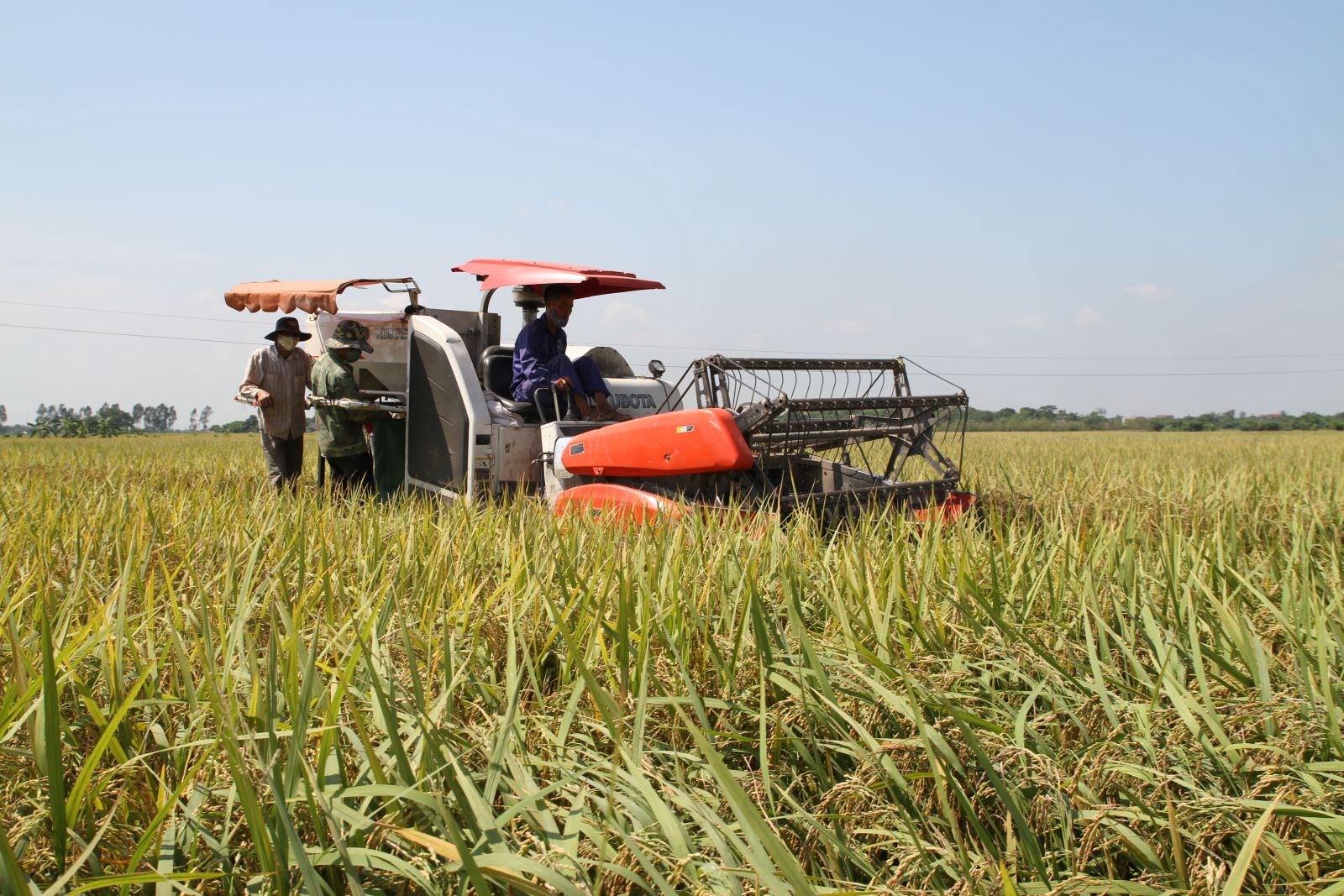 Người dân huyện Quỳnh Phụ, tỉnh Thái Bình thu hoạch lúa trên cánh đồng mẫu lớn. Ảnh: TRỊNH CƯỜNG |