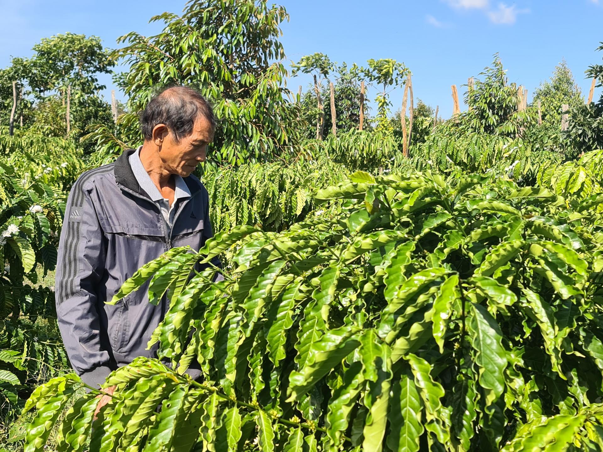 Ông Thành kiểm tra vườn cà phê tái canh giống mới. |
