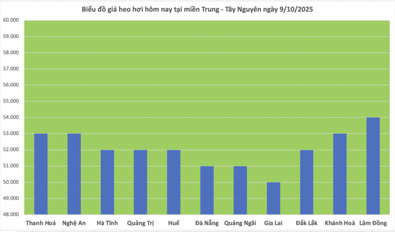 Đà Nẵng và Quảng Ngãi giữ giá 51.000 đồng/kg, trong khi Gia Lai tiếp tục là địa phương có mức thấp nhất khu vực với 50.000 đồng/kg.