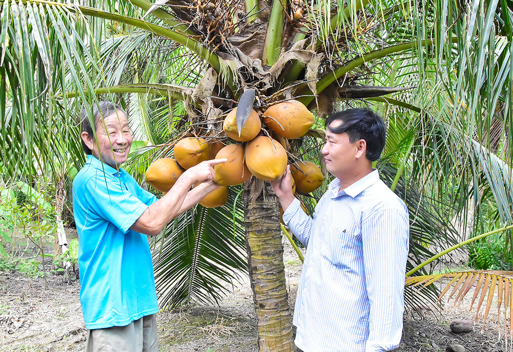 | Nông dân Mai Văn On (bên trái) trao đổi kinh nghiệm trồng dừa hữu cơ. |