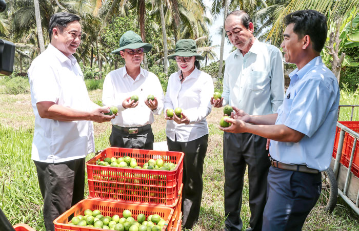 | Ông Châu Văn Hòa- Tỉnh ủy viên, Phó Chủ tịch UBND tỉnh (thứ hai, từ trái sang) tham quan vườn chanh không hạt ấp Đai Tèn, xã Song Lộc. |
