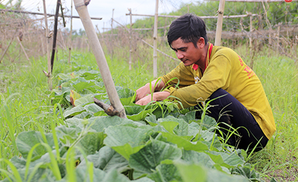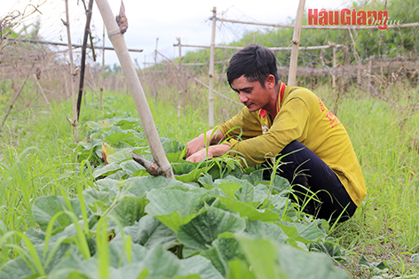Anh Trương Văn Triều, ở ấp Mỹ Quế B, thị trấn Cây Dương, huyện Phụng Hiệp, chăm sóc cho vườn rau của mình.