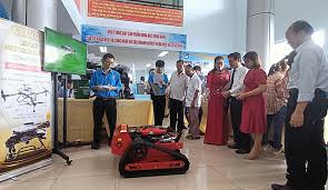 Đại biểu tham quan mô hình máy cắt cỏ tự động của Công ty TNHH đầu tư thiết bị nông nghiệp Sài Gòn (TP.Hồ Chí Minh). |