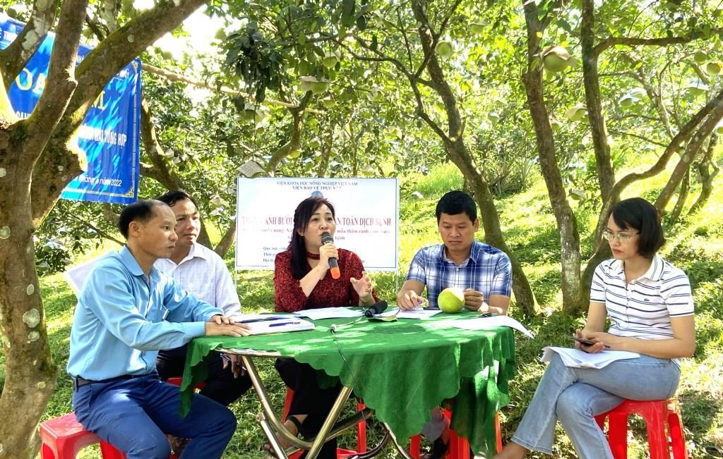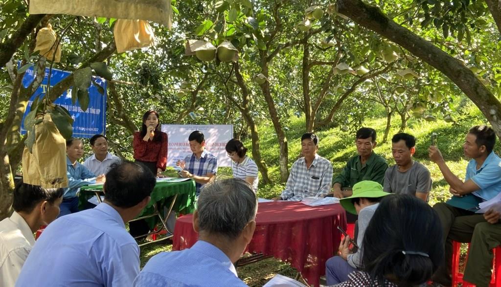 Đến dự và tư vấn cho bà con nông dân có các chuyên gia của Viện Bảo vệ thực vật Trung ương, cán bộ kỹ thuật của Trung tâm Khuyến nông Hà Tĩnh cùng các hộ nông dân trồng bưởi tại xã Hương Thủy, huyện Hương Khê.