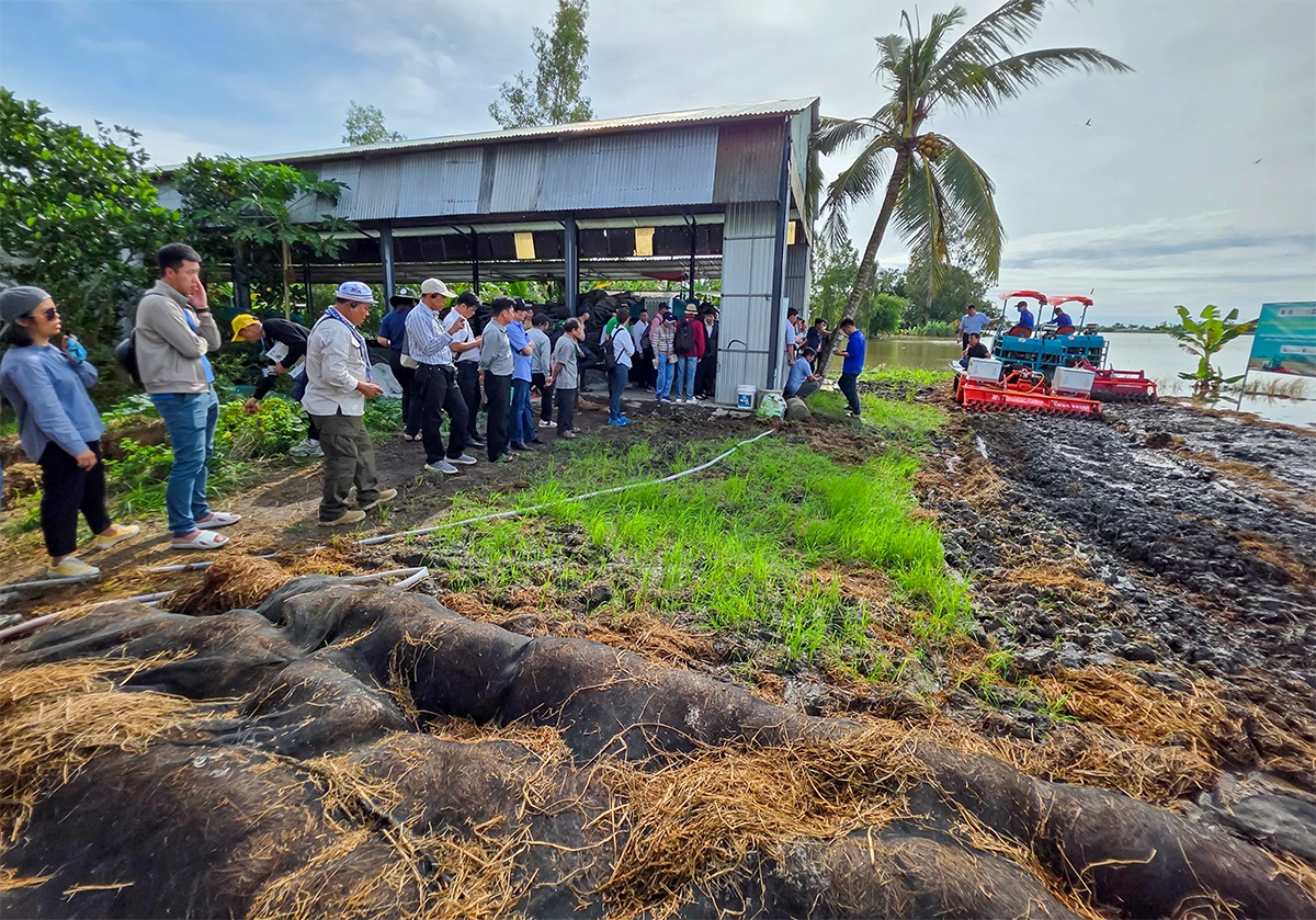 Nông dân và các đại biểu là cán bộ khuyến nông, doanh nghiệp, đại diện các HTX, cơ quan quản lý nhà nước, tổ chức quốc tế… đã tham quan thực tế đồng ruộng và tận mắt chứng kiến việc trình diễn các máy móc, công nghệ xử lý rơm rạ và việc quản lý, sử dụng rơm rạ theo hướng kinh tế tuần hoàn tại HTX Tiến Thuận.