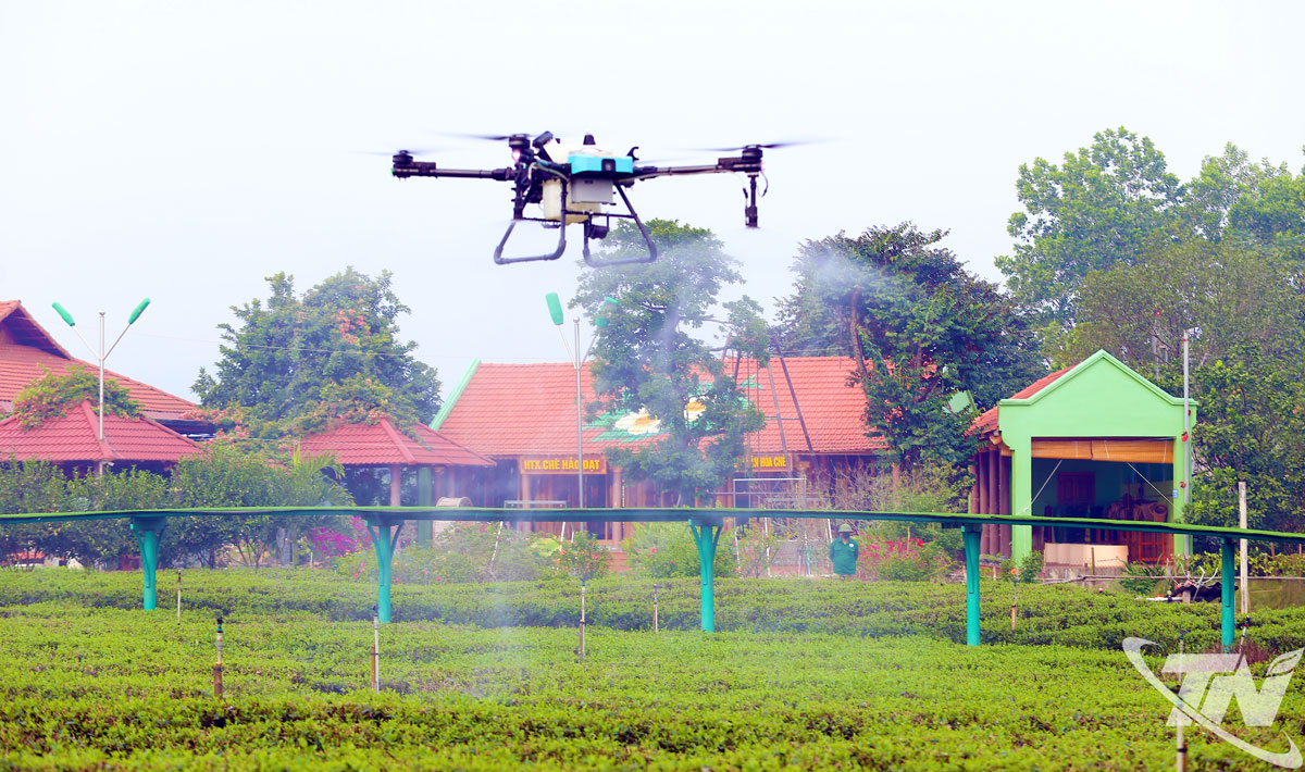 Sử dụng thiết bị bay không người lái để chăm sóc cây chè tại HTX chè Hảo Đạt. Ảnh: T.L |