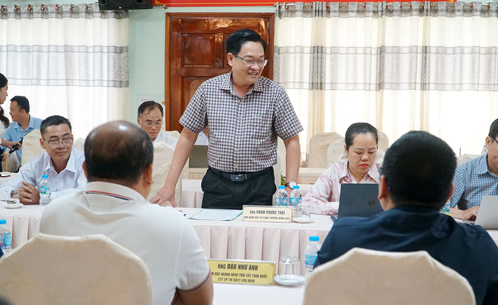 Tại buổi làm việc, ông Đậu Như Anh- Giám đốc ngành hàng trái cây toàn quốc, Công ty CP Thương mại Bách Hóa Xanh, giới thiệu định hướng thu mua nông sản, cho biết hiện đơn vị này có hơn 2,9 ngàn cửa hàng trên toàn quốc, trong đó khoảng 80 cửa hàng tại Vĩnh Long.