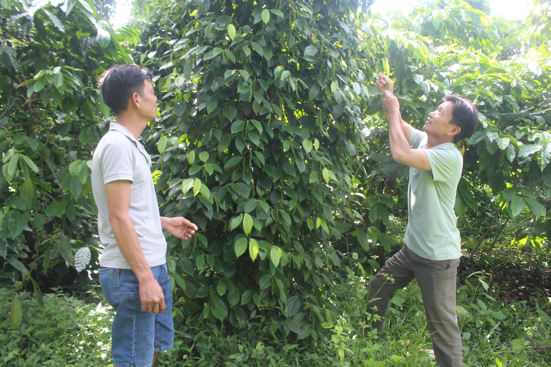 Anh Ngô Văn Nam (bên trái), xã Nam Dong, thành viên HTX Bình Minh sản xuất theo phương pháp hồ tiêu cảnh quan từ năm 2023