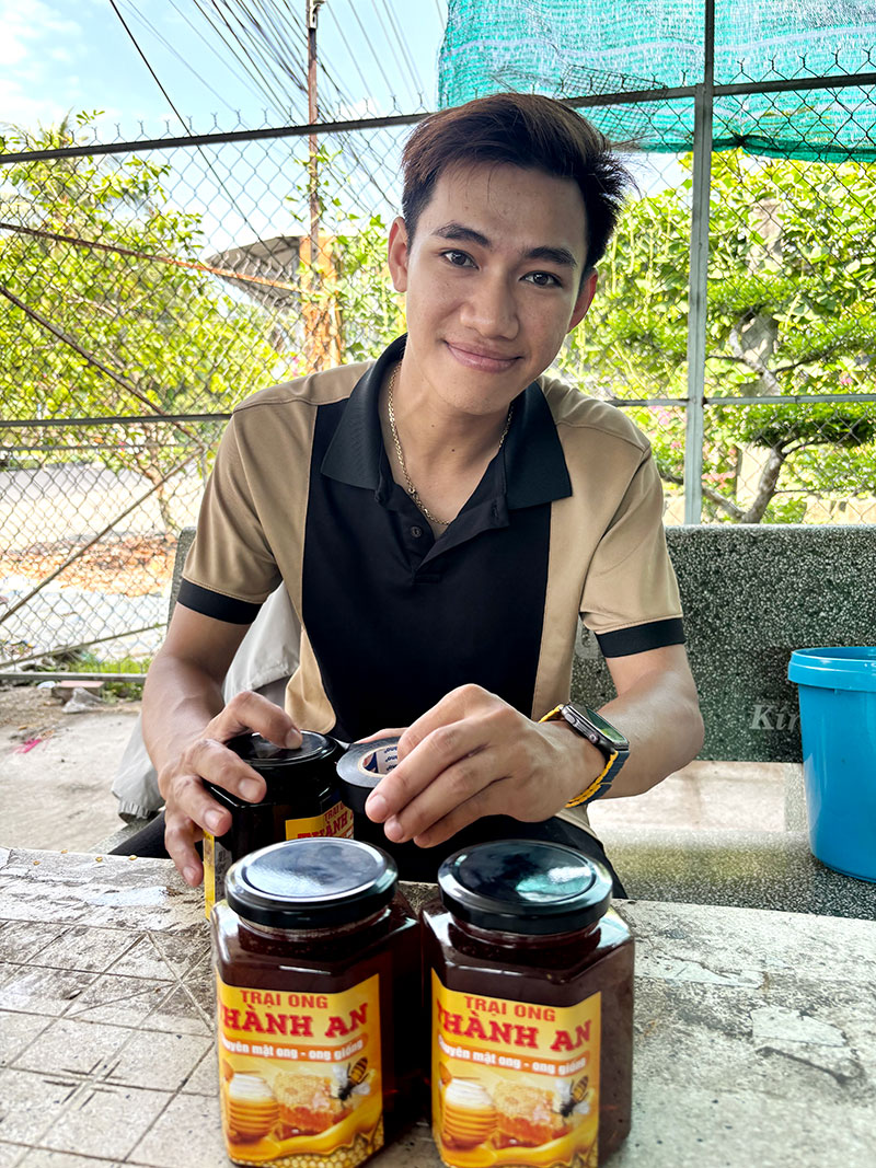 Từng đi hợp tác lao động ở Nhật Bản rồi về nước làm cho công ty khoảng 2 năm ở TP Hồ Chí Minh, anh An quyết định quây về quê hương “làm chủ”. Từ chăn nuôi heo, mở phòng tập gym và gầy dựng đàn nuôi ong mật- công việc mà mình đã gắn bó ngay từ năm học lớp 8. Ong hút mật chủ yếu từ các vườn dừa, mùa nắng sẽ cho chất lượng tốt nhất, trung bình 2 tuần lấy mật lần, với giá 400 ngàn đồng/lít.