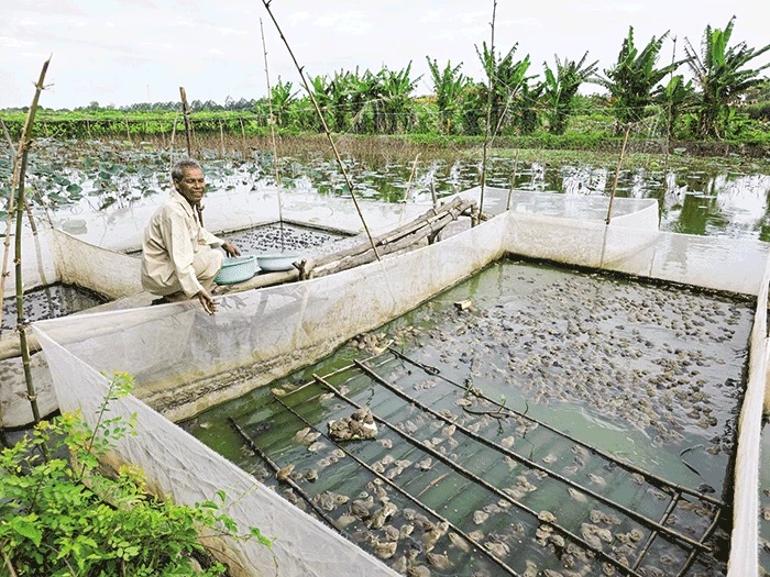 | Mô hình nuôi ếch trong vèo của ông Phạm Văn Vàng ở phường Ô Môn, TP Cần Thơ. |