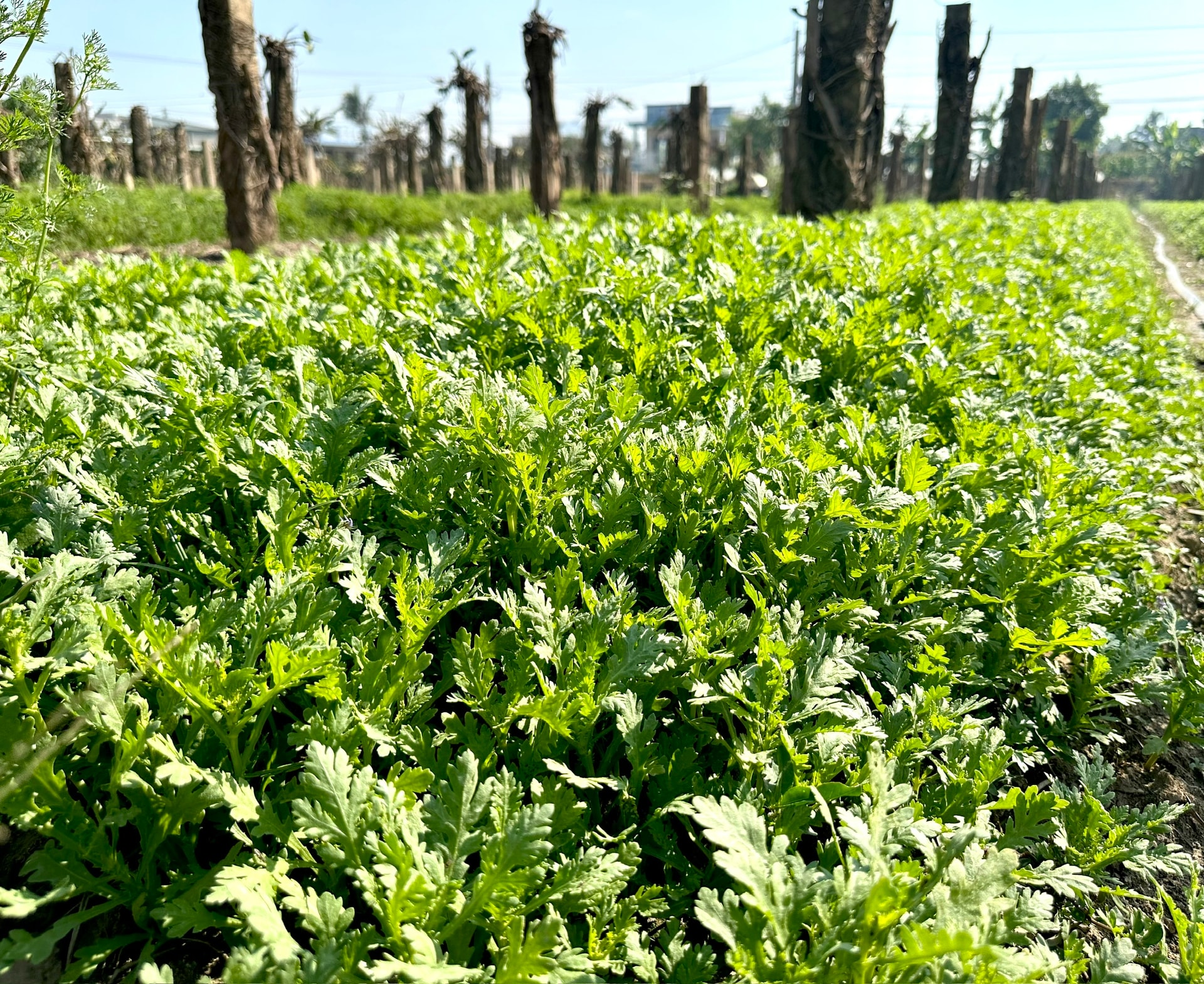 Sự vực dậy màu xanh sau lũ ở vùng đất Hàm Liêm cũng được chúng tôi cảm nhận ở vùng trồng rau thôn Hội Nhơn. Nắng chói chang nhưng bà Nguyễn Thị Mười (tổ 6, thôn Hội Nhơn) và chồng vẫn đang nhổ cỏ. Vạt ngò gai xanh mướt đang gần đến ngày thu hoạch, những luống tần ô xòe lá, ngò gai thơm nồng trong gió. Đây là cách gia đình bà cũng như nhiều phụ nữ khác trong thôn đứng dậy sau mất mát do thiên tai.