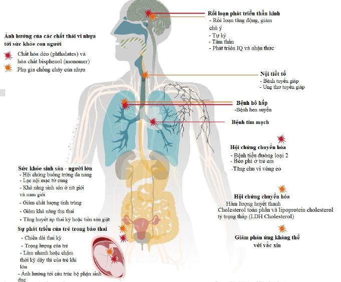 Các sản phẩm nông nghiệp như cá đánh bắt từ biển, lương thực thực phẩm chứa vi nhựa sẽ theo chuỗi thức ăn xâm nhập vào cơ thể con người. Hạt vi nhựa sau khi xâm nhập và di chuyển, tích tụ sẽ gây ra những rối loạn tới các cơ quan, bộ phận trong cơ thể con người. Báo của các nhà khoa học về ảnh hưởng của vi nhựa tới sức khỏe mới đây cho thấy, hiện tượng phù và tắc nghẽn là hậu quả do tích tụ các hạt vi nhựa. Hạt vi nhựa gây stress oxi hóa và độc tính trên tế bào con người, gây độc tế bào ở não bộ và tế bào biểu mô. Thêm vào đó, hạt vi nhựa còn gây ảnh hưởng trực tiếp đến chuyển hóa bằng cách làm biến đổi enzyme chuyển hoá hoặc gây mất cân bằng năng lượng. Các bệnh liên quan đến hệ thần kinh, rối loạn tăng động giảm chú ý ở trẻ, chứng tự kỷ, tâm thần, các bệnh tim mạch cũng được chứng minh là có liên quan tới vi nhựa (Hình 1).