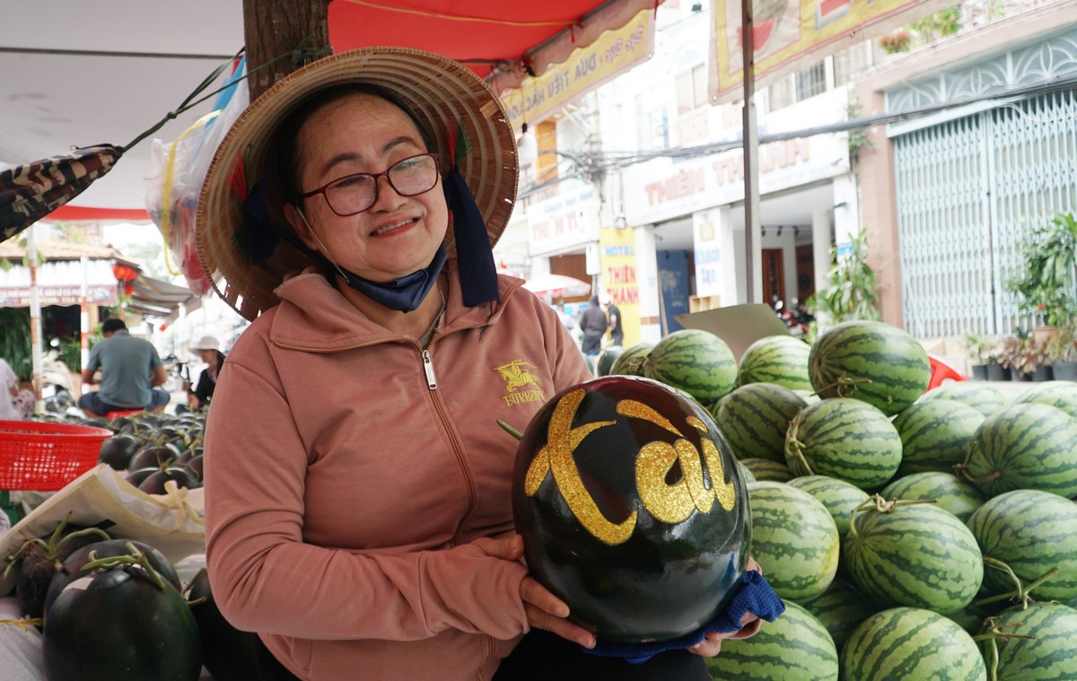| Đặc biệt trong dịp Tết, những trái dưa hấu tròn to được khắc chữ như “vạn sự như ý”, “tài lộc”, “bình an”, “an khang”, “thịnh vượng”... thu hút đông đảo người mua. |