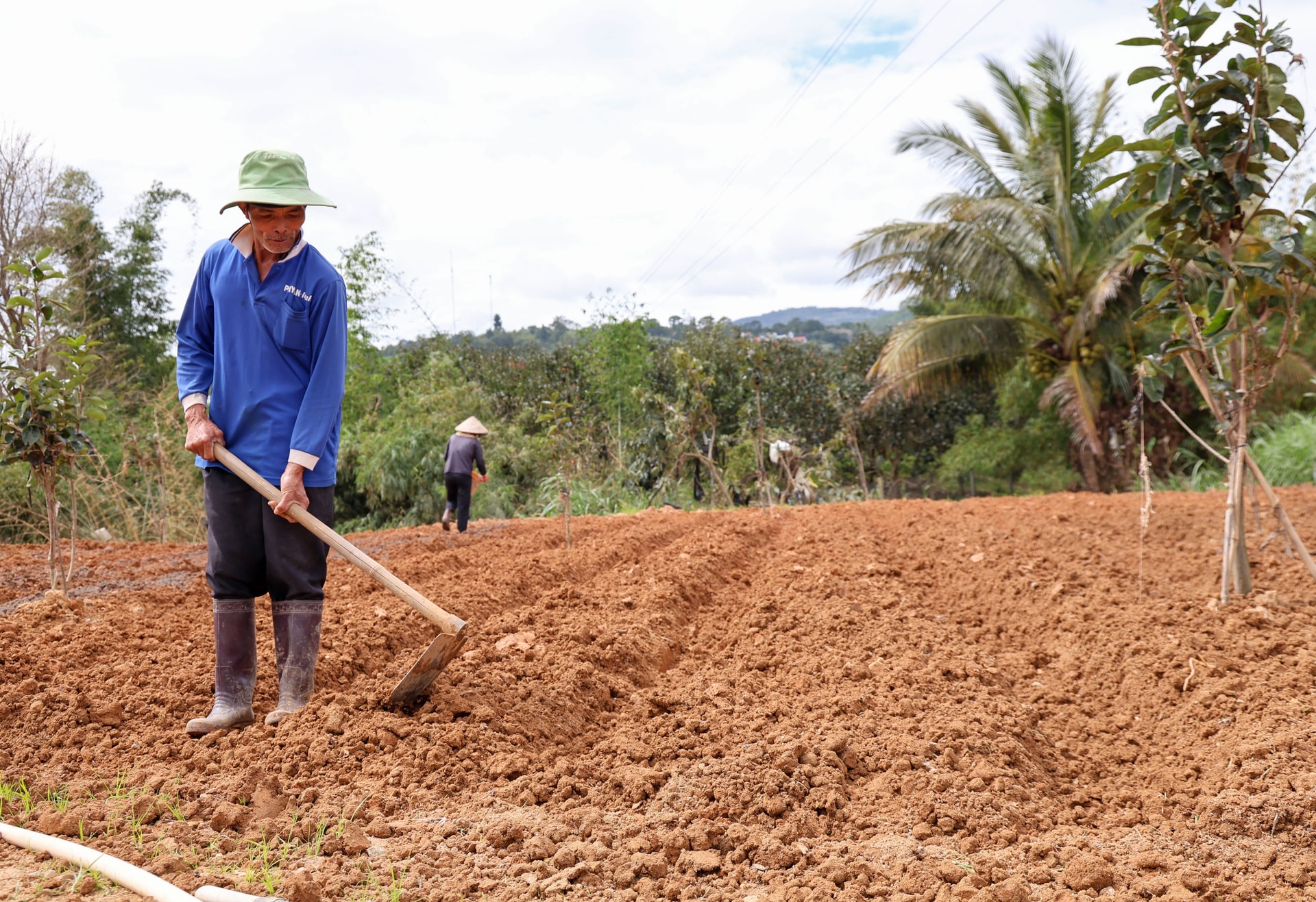 Vợ chồng ông Nguyễn Ngọc Hướng cải tạo đất trước khi xuống giống cà chua