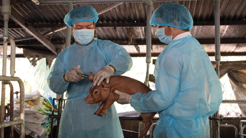 Cán bộ thú y tiêm phòng bệnh cho heo