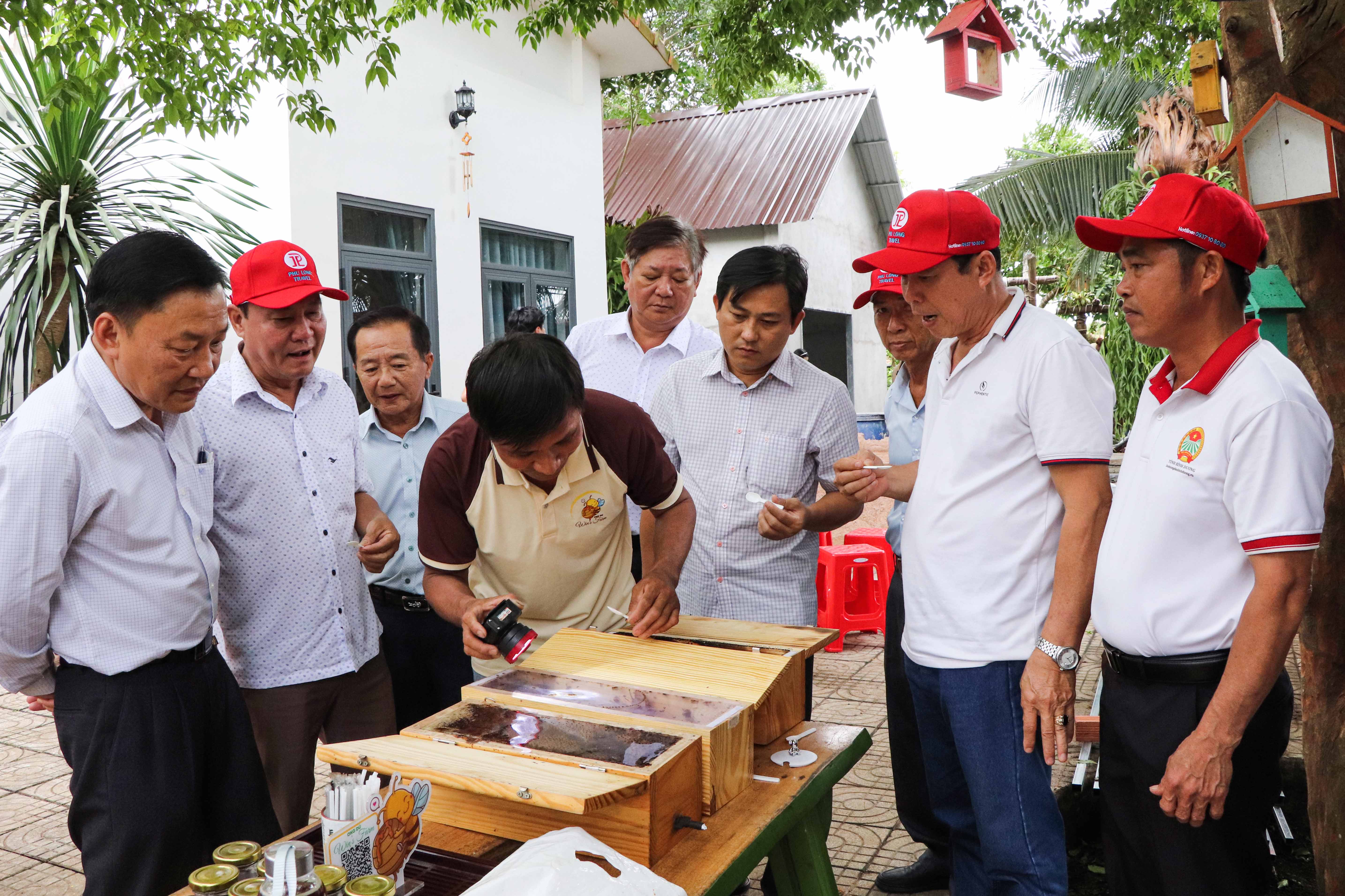 Theo đó, đoàn đã đến tham quan, tìm hiểu quy trình tách đàn ong, nhân giống và thu hoạch mật ong tại trại ong dú Win’s Farm của HTX Nông nghiệp-Thương mại-Dịch vụ-Du lịch Nuôi ong dú Châu Đức. Trại ong dú Win’s Farm có diện tích hơn 1.500m² với hơn 300 thùng ong đang cho thu hoạch mật và cung cấp ong giống.