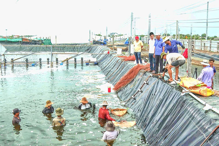 | Thu hoạch tôm công nghệ cao tại xã Thạnh Hải. |