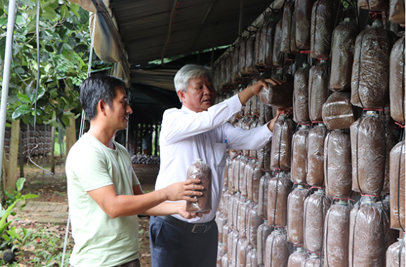| Phó Chủ tịch Hội Nông dân huyện Châu Đức Thân Xuân Động tham quan mô hình trồng nấm mèo, nấm bào ngư của gia đình ông Hoàng Đệ Tam, ấp Liên Lộc, xã Xà Bang. |